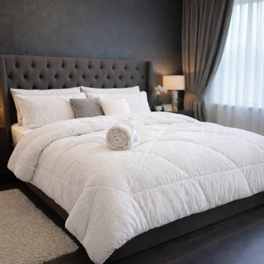 Couette AVEC SHERPA ("Pour l'Agneau à l'intérieur"). Avec une touche douce et moelleuse sur le dessus et avec les poils d'agneau à l'intérieur, il rendra les nuits froides plus chaudes, fait une couette et une couverture.