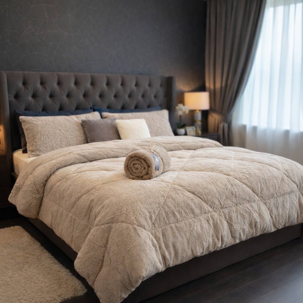 Couette AVEC SHERPA ("Pour l'Agneau à l'intérieur"). Avec une touche douce et moelleuse sur le dessus et avec les poils d'agneau à l'intérieur, il rendra les nuits froides plus chaudes, fait une couette et une couverture.