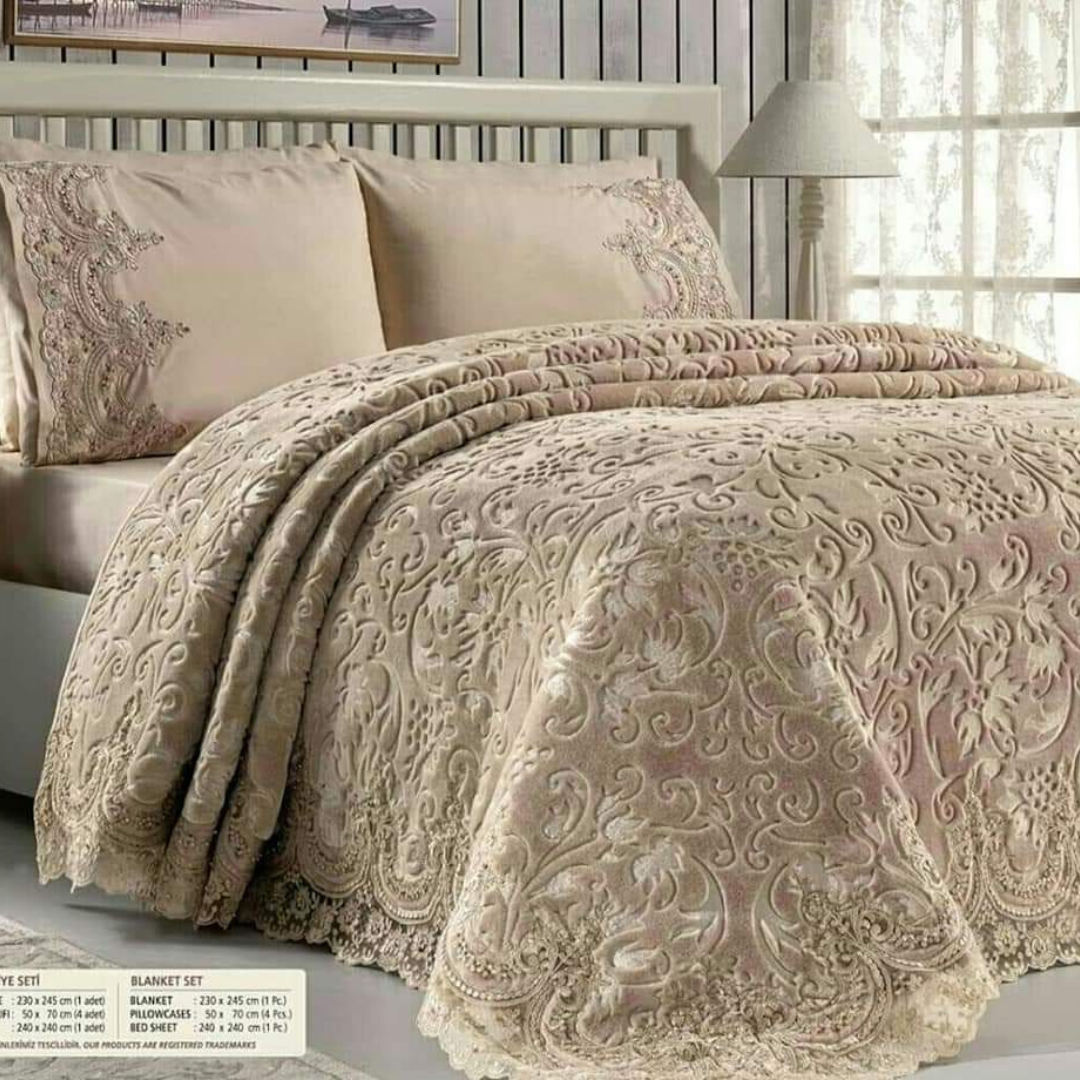 Composé d’une couverture spacieuse (240 x 250 cm), de quatre taies d’oreiller – deux en dentelle décorative et deux pour le couchage (50 x 70 cm chacune) – ainsi que d’un drap assorti (240 x 260 cm), cet ensemble allie élégance et confort au quotidien.